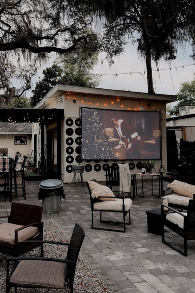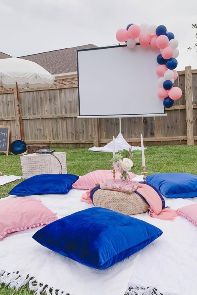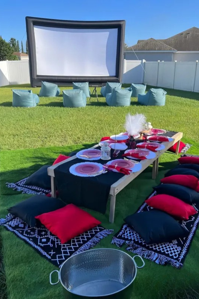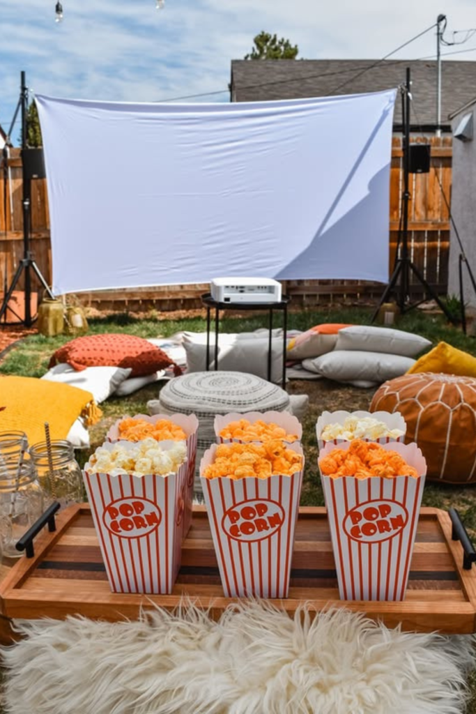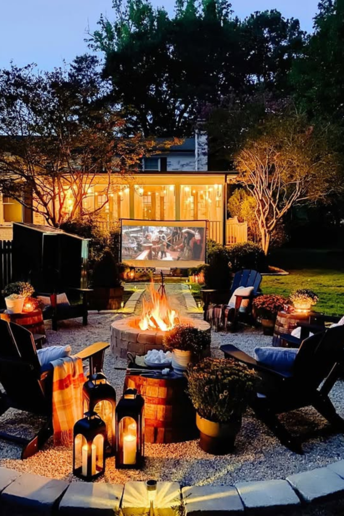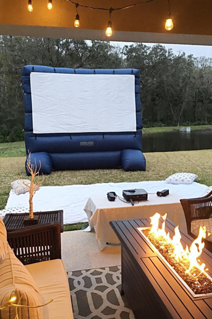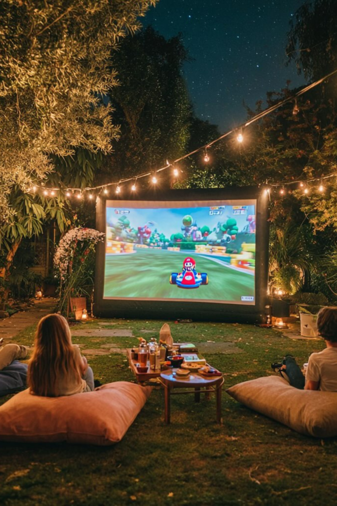 Keep lights away from the screen area and add a few ground-level candles for illumination; ideal for small backyards.
