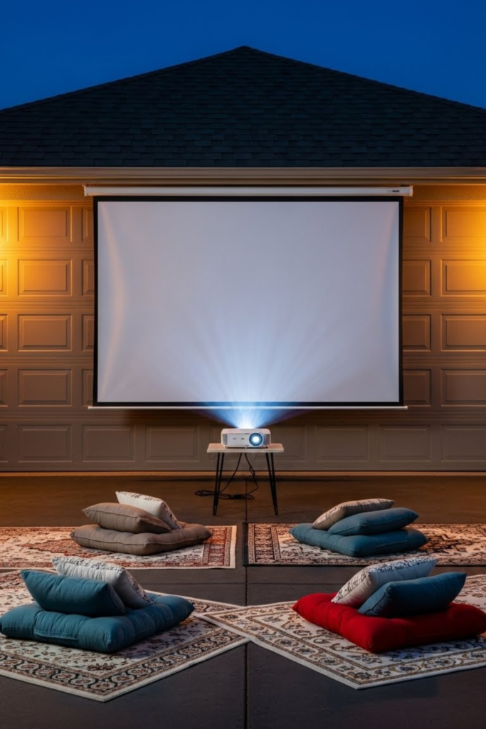 Mounting a pull-down or fixed screen on a frame or railing. For comfortable watching, use low seats, floor mattresses, and throws.