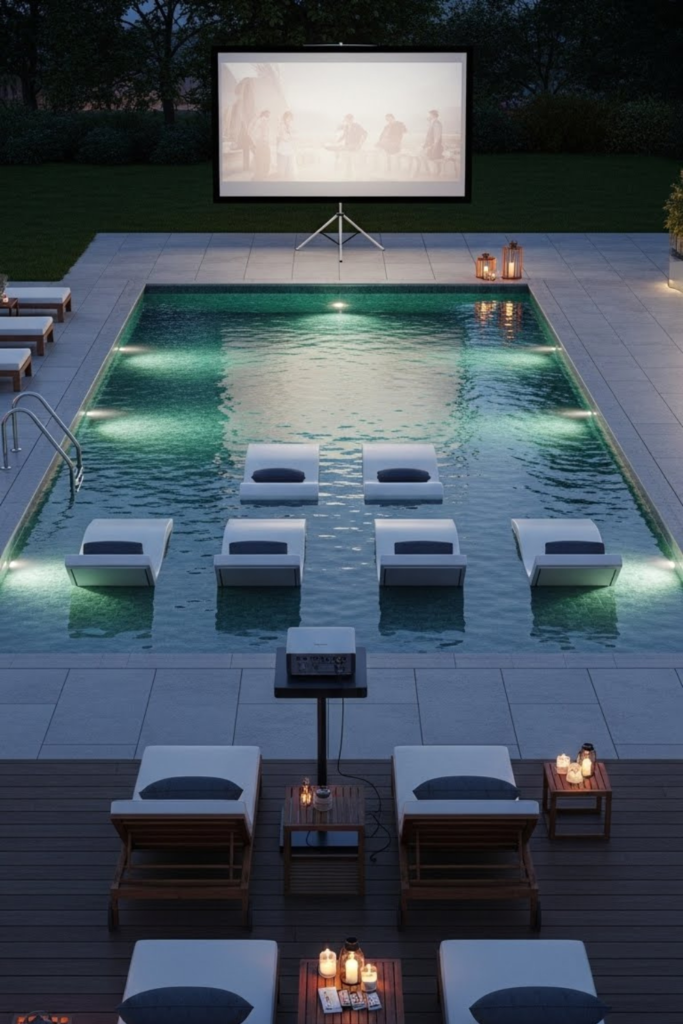Place an inflatable or freestanding screen at the far edge of the pool. Along the deck, place chairs or float loungers.
