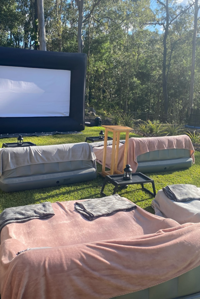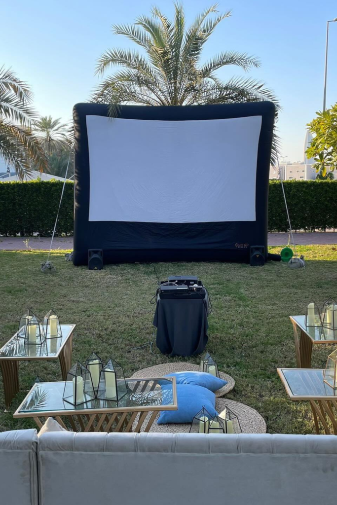 The inflatable screen provides scale. Use small side tables for drinks and modular outside seats to recreate it.