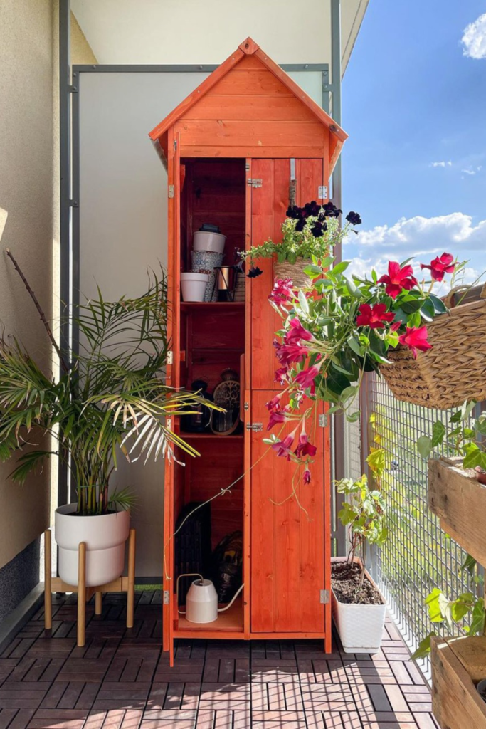 Slim wooden garden cabinet like this keeps pots, watering cans, and soil neatly stacked. Perfect for open balconies.