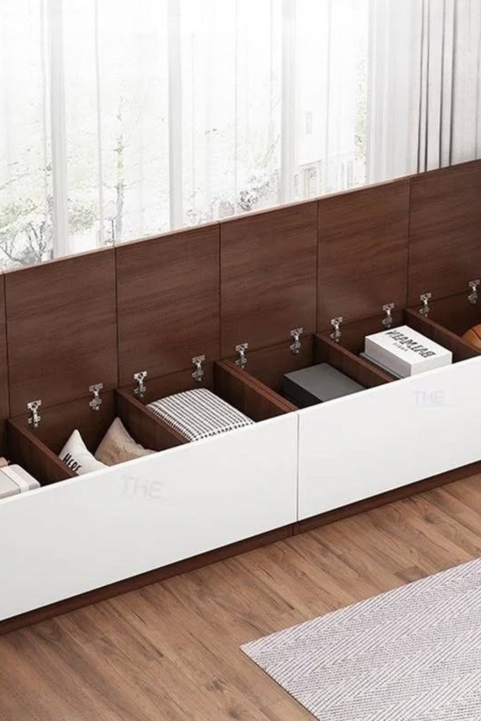 Nothing hides clutter better than seating that opens up. Long lift-top bench like this stores cushions, tools, or seasonal items.