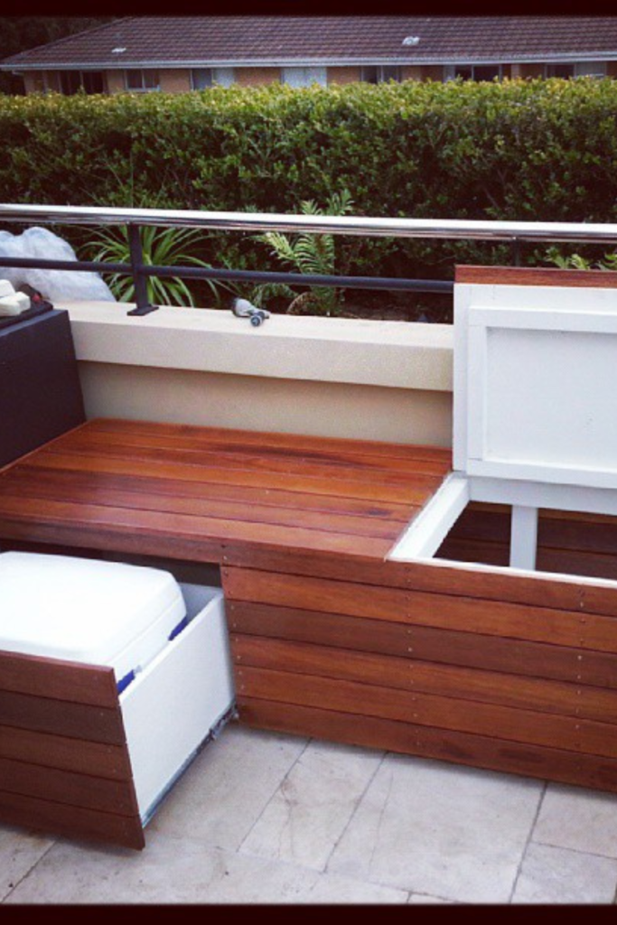 Outdoor clutter disappears when the seating lifts up. Bench with built-in compartments like this hides storage boxes inside.