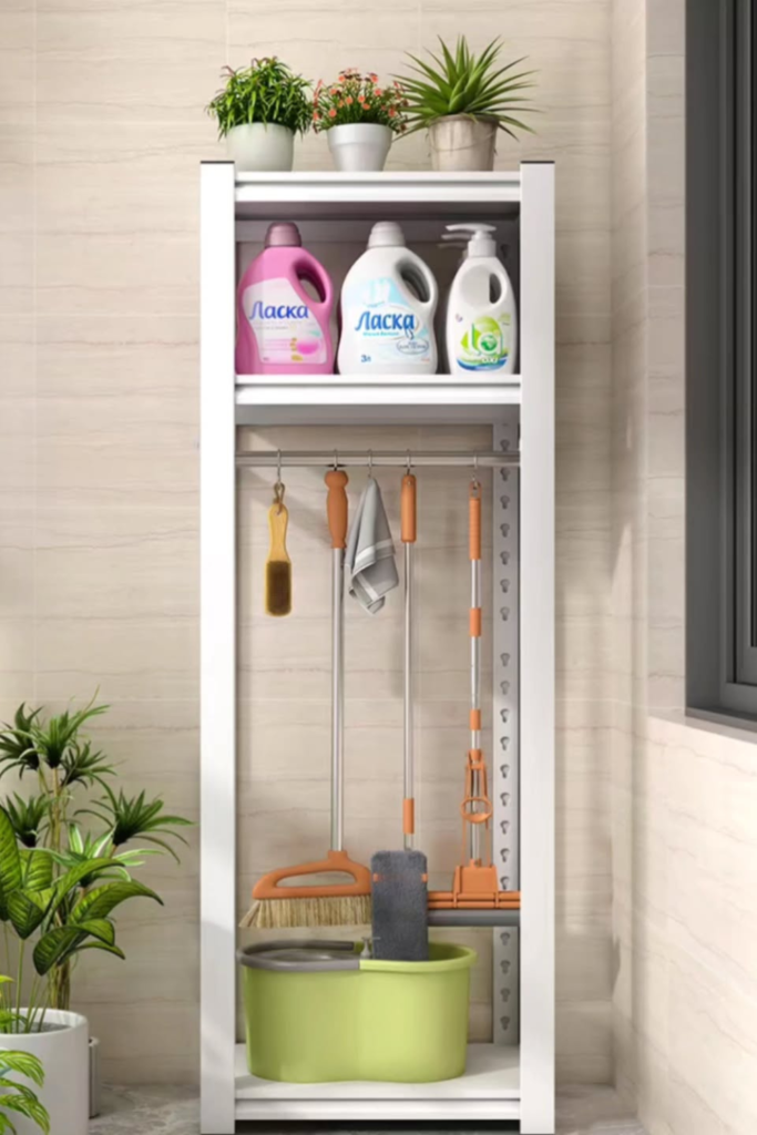 Cleaning supplies need a home that isn’t the floor. A narrow vertical rack like this fits tight balcony corners.