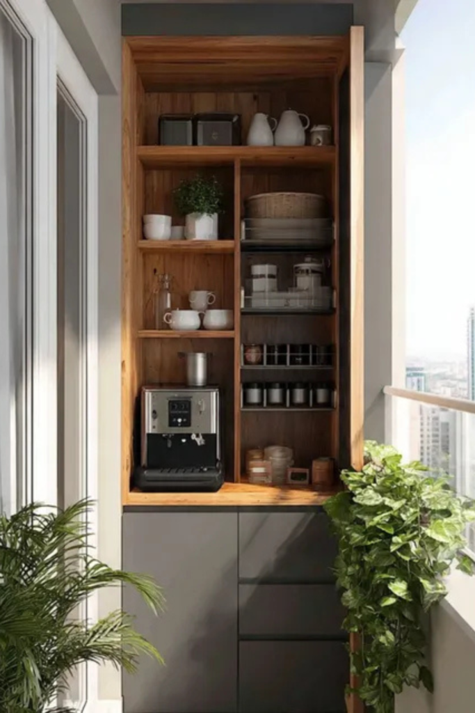 Closed doors hide visual clutter, and open shelves above let you style a few pieces without crowding the balcony.
