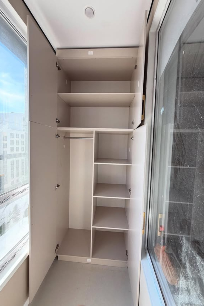 Tall storage changes everything on a narrow balcony. Full-height cabinet like this keeps bulky items completely out of sight.