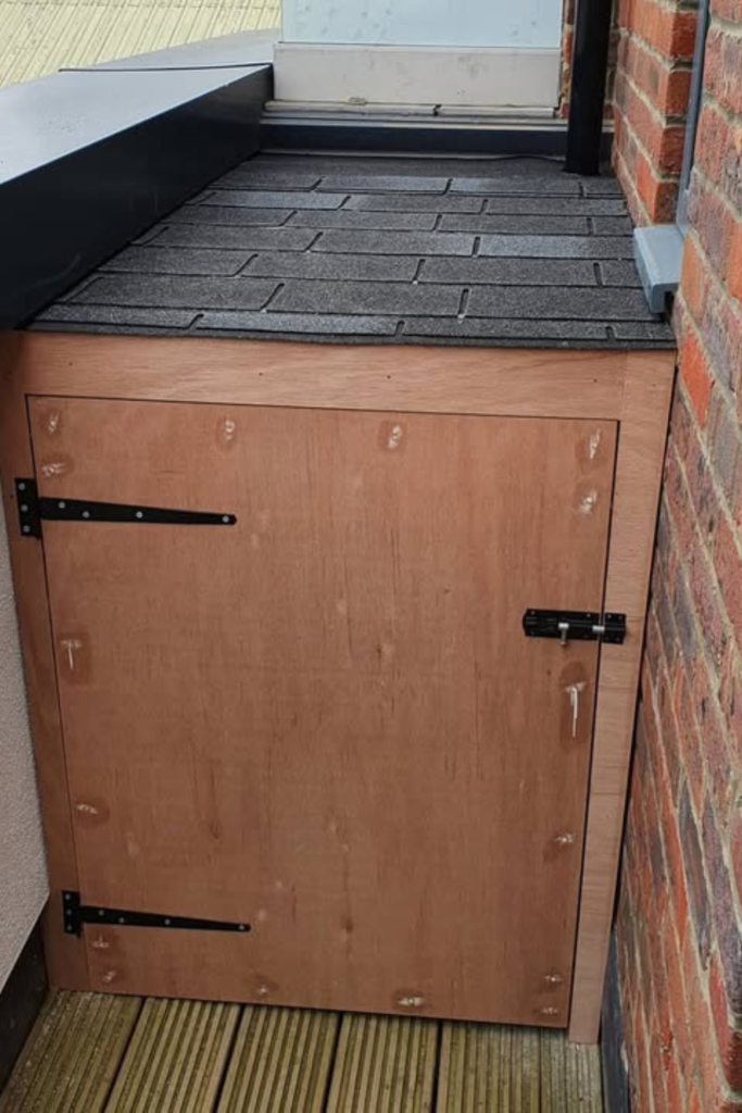 Perfectly for tools, soil bags, or cleaning supplies. Use weather-resistant plywood and seal all edges to handle rain exposure.