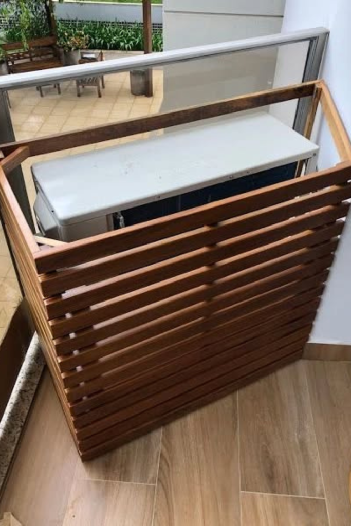 Bulky outdoor units ruin the look fast. A slatted wooden cover like this hides the AC system while still allowing airflow.