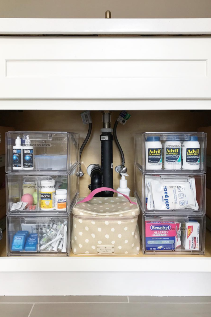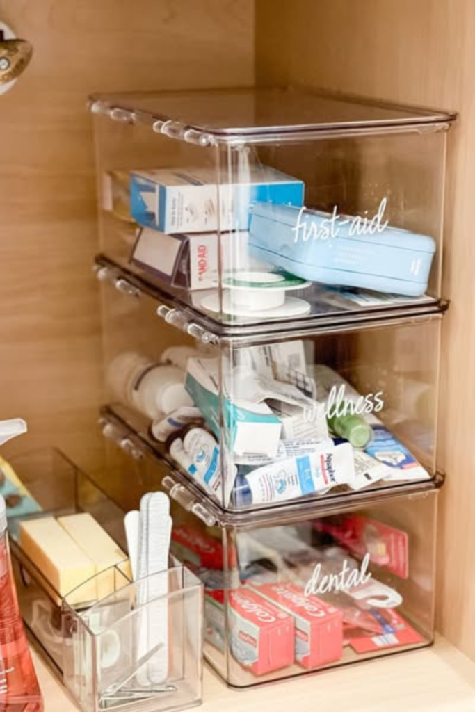 Bins handle first-aid, dental, and illness supplies, choosing matching containers that fit side by side and stack cleanly around plumbing.