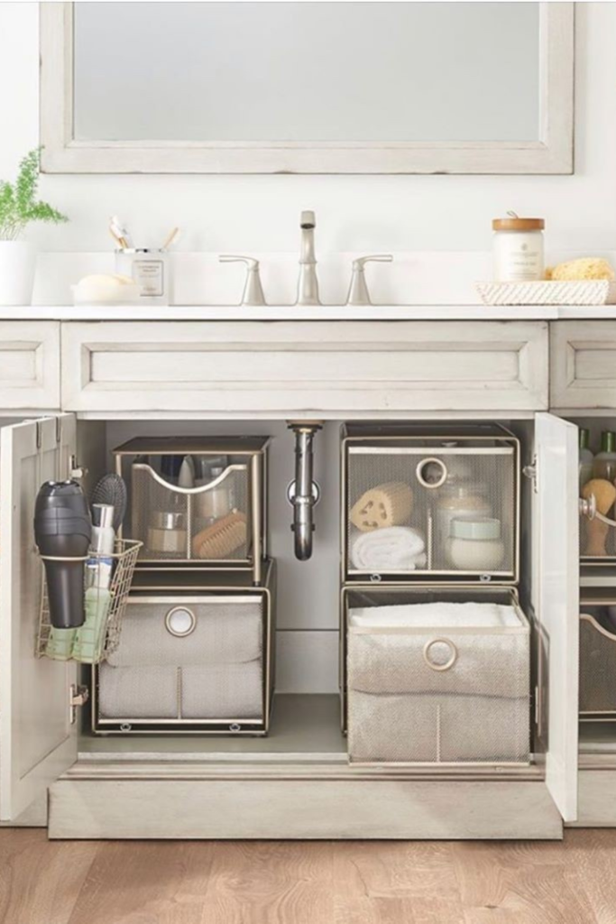 Recreate this by measuring pipe clearance first, then choosing modular clear organizers that slide in cleanly.