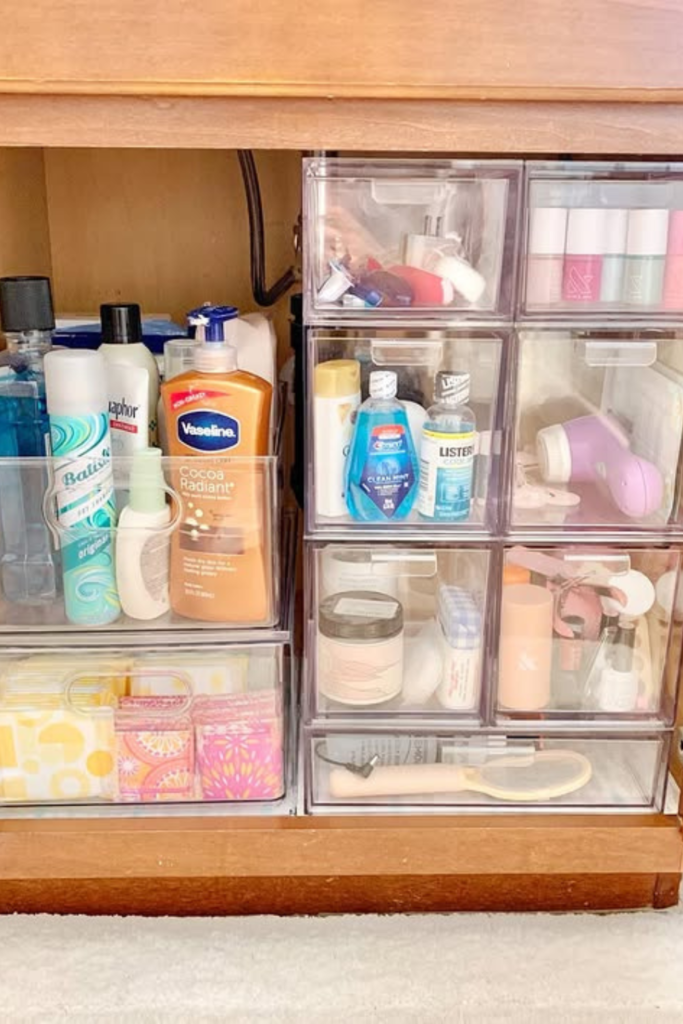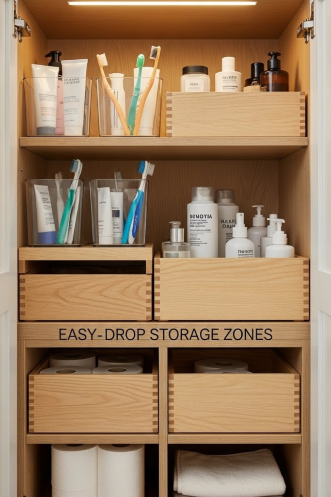 Use vertical drawer units to turn a deep cabinet into small, easy sections. Skincare, dental, and grooming tools stay separated.