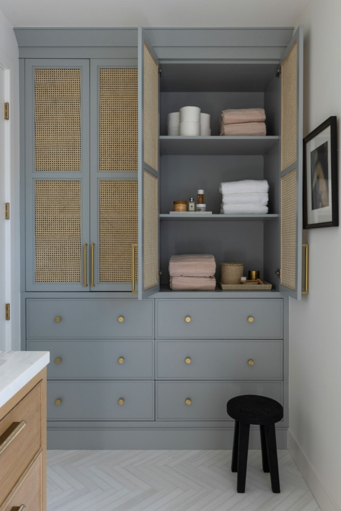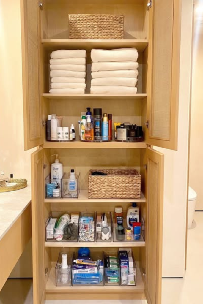 Reserve tall cabinets for towels and bulk items so smaller cabinets don’t get overwhelmed. Fold towels to a uniform size.