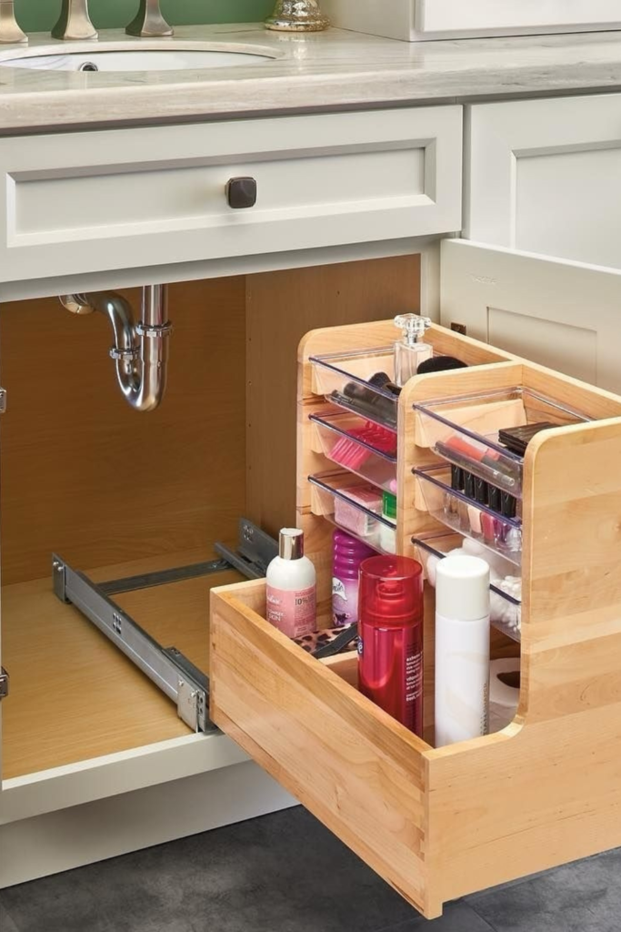 Turn deep under-sink cabinets into usable storage so nothing gets lost behind plumbing. Sliding organizers work best.