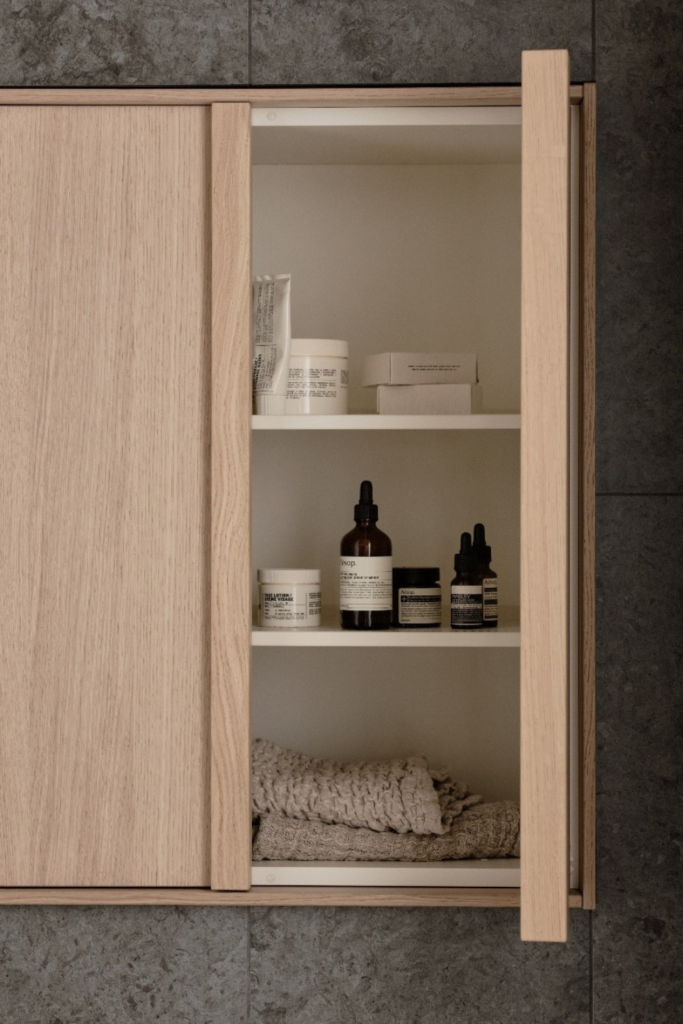 Only items used in that bathroom should live in the cabinet. Skincare, hair care, dental products, and everyday grooming tools.