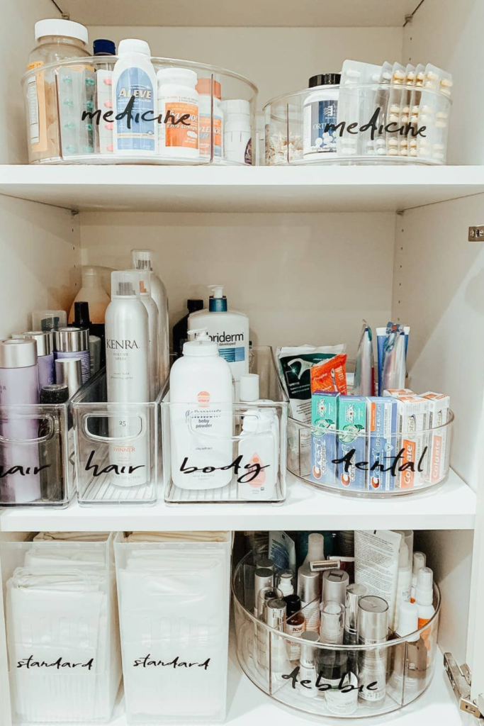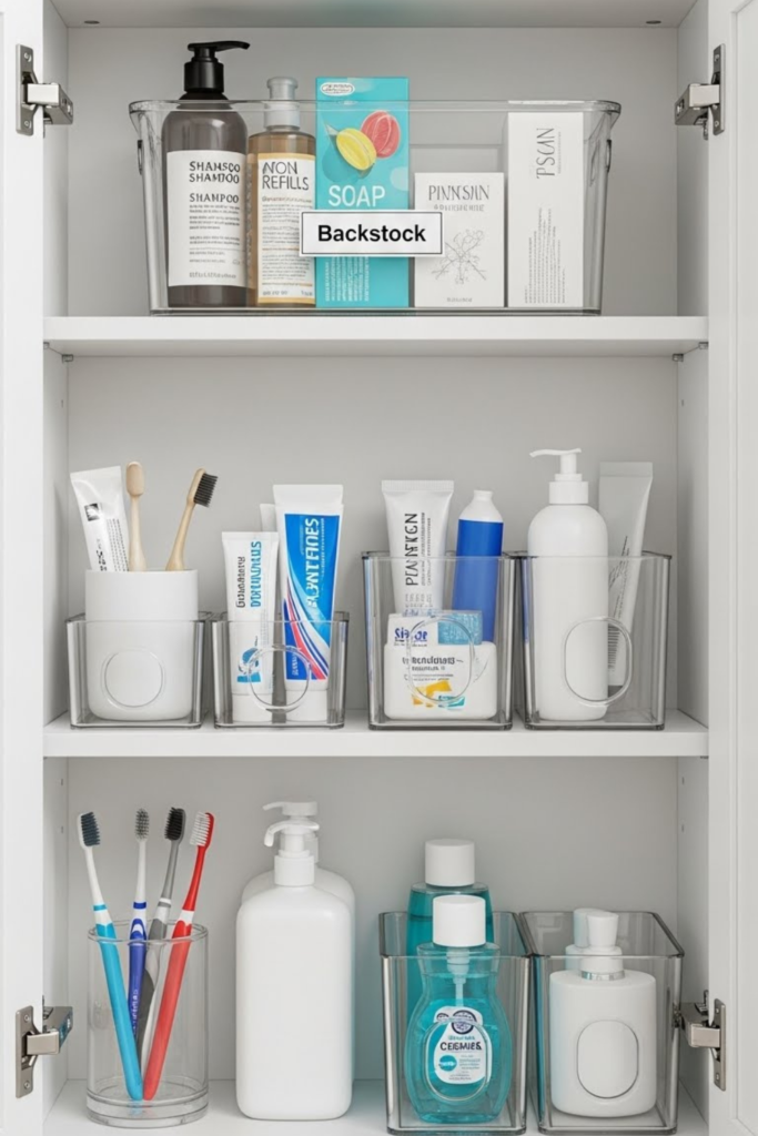 Stop digging through mixed products by giving every category its own clear container. Hair, body, dental, and meds stay easy to spot.