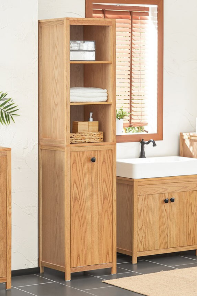 Open shelves handle towels and daily items, while the lower compartment hides hampers or bulky supplies.