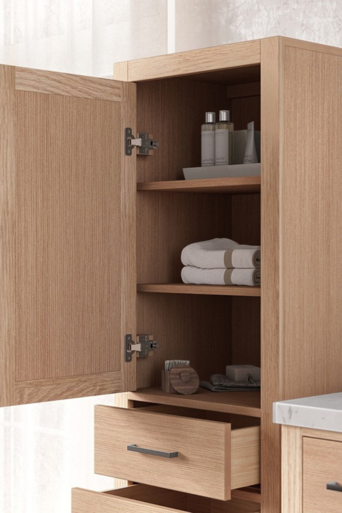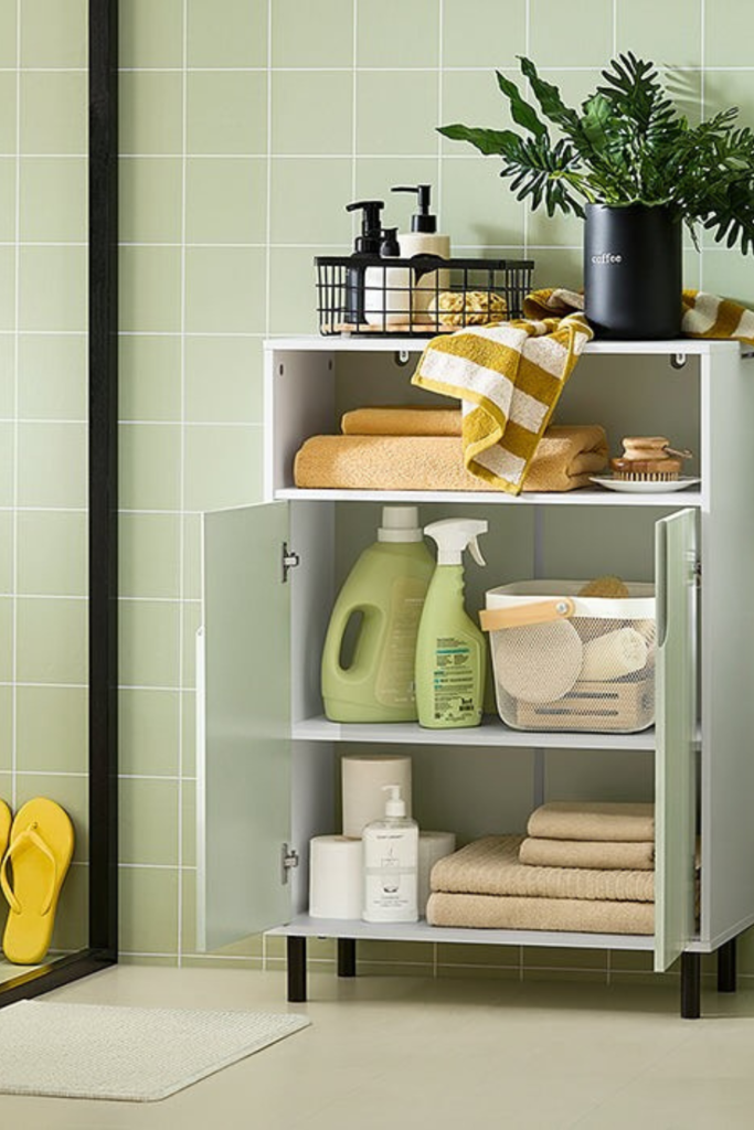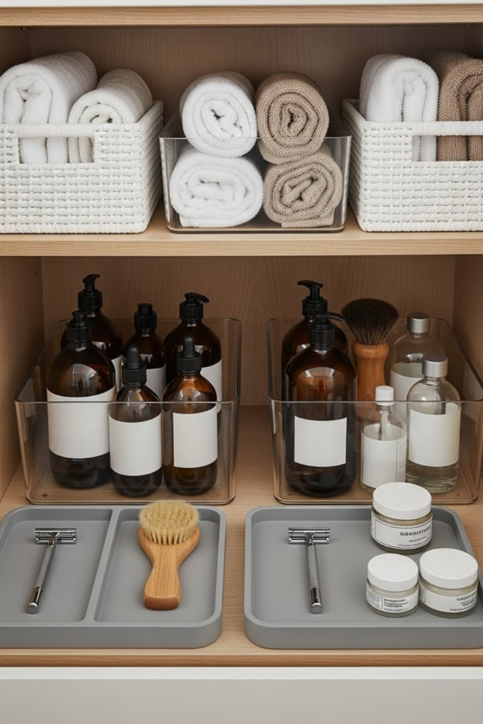 Folded towels sit neatly in the middle, and small tools belong lower where hands naturally reach, and leaving space around items.
