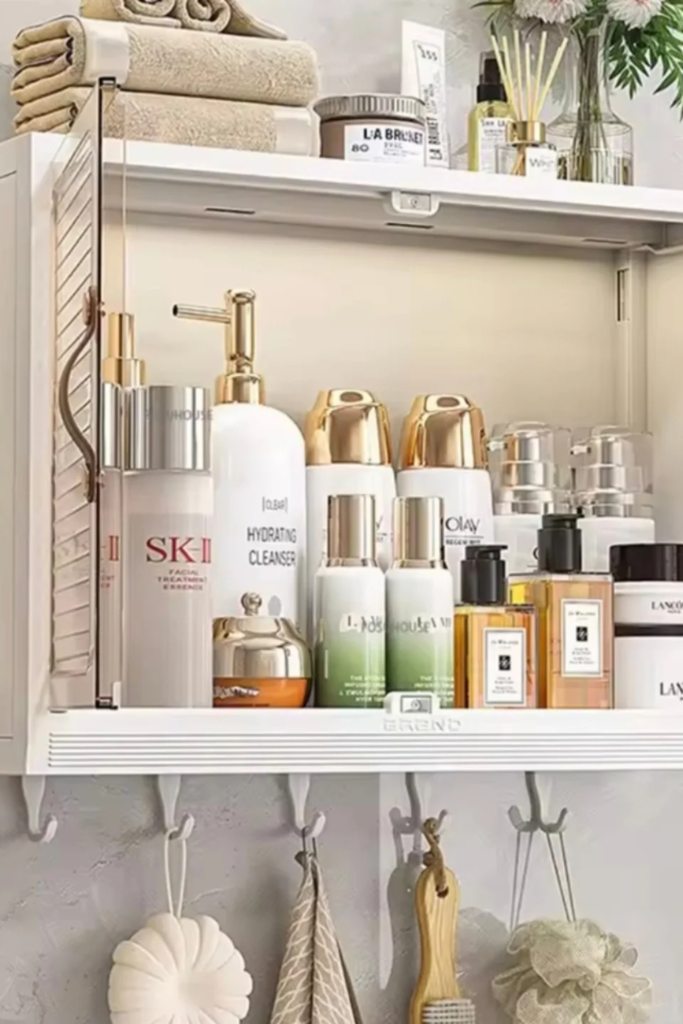 Skincare and serums work best at eye level, backups belong higher up, and folded towels fit neatly on the lowest shelf.