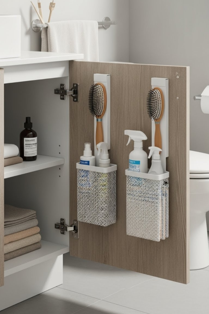 Cabinet doors hide usable space that usually goes ignored. Slim racks or adhesive pockets hold brushes, sprays, or cleaning cloths.