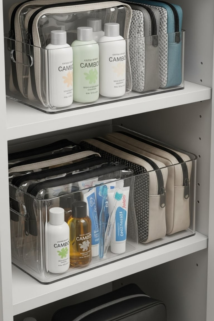 Loose travel items create chaos when scattered. Small pouches work best grouped together in one grab-and-go area.