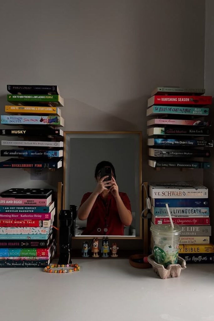 If you do not have space for a bookshelf, try using your desk or vanity as a base. You can stack books around your mirror to create a frame.