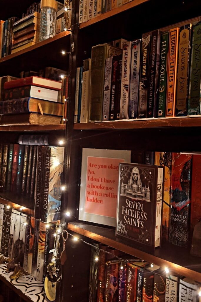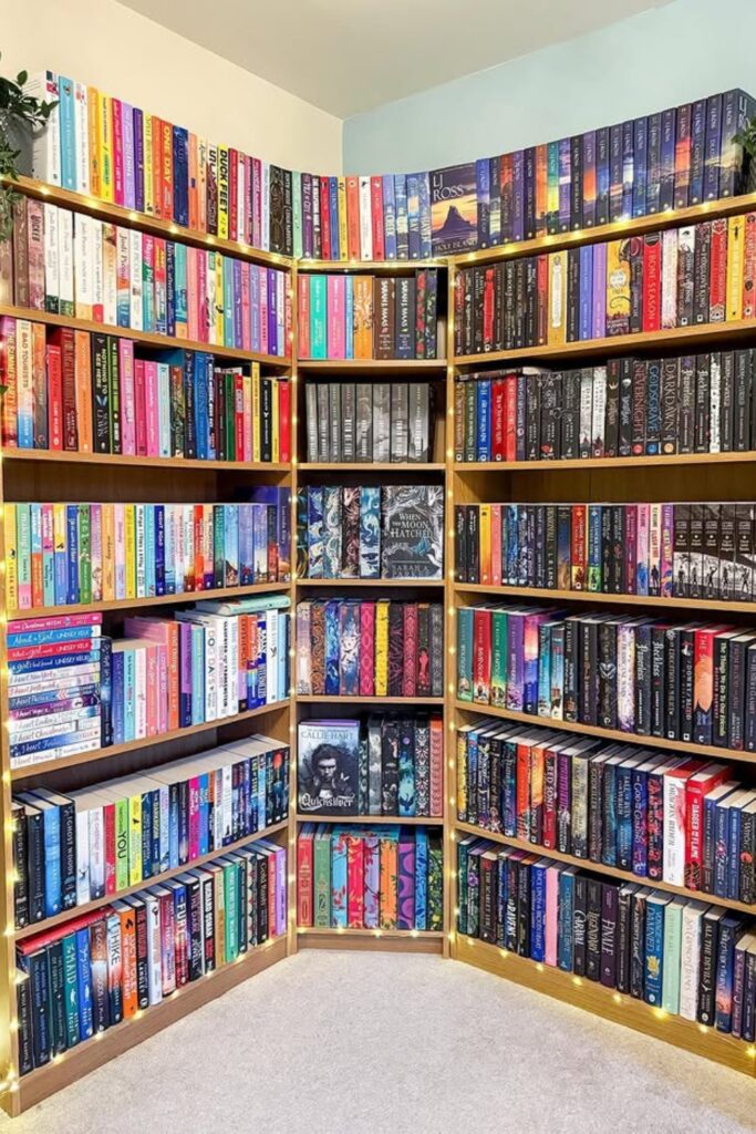 You can make your bookshelves feel more welcoming by adding soft string lights.