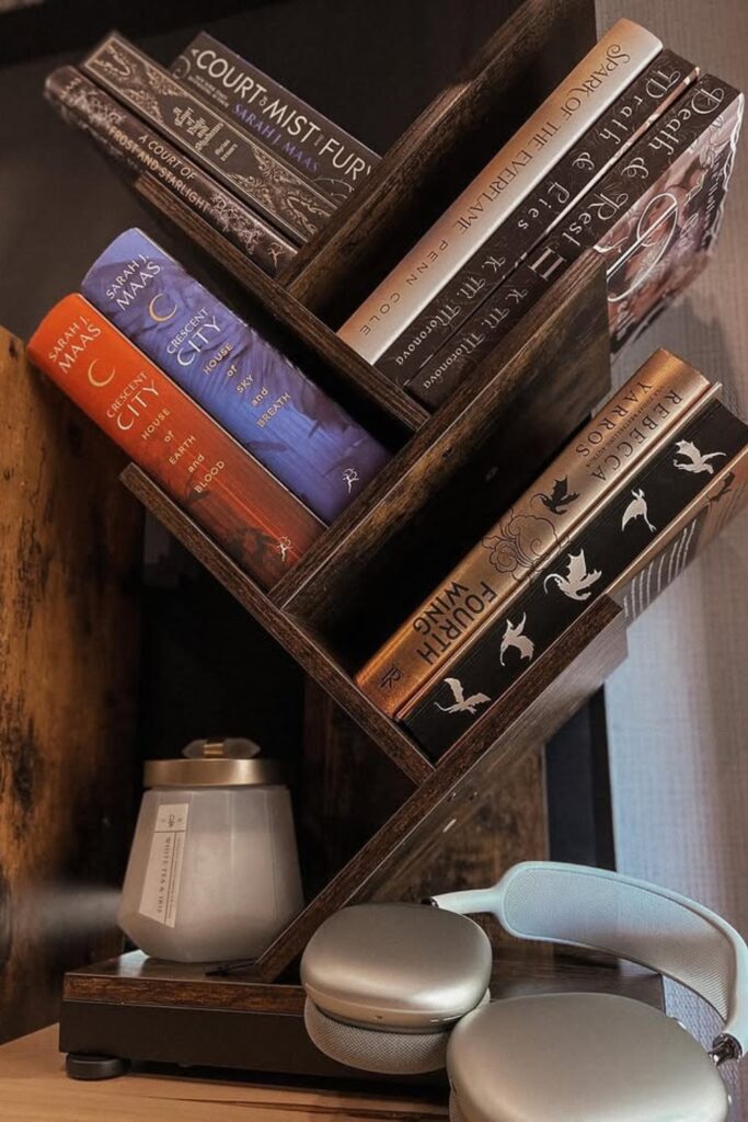 When you do not have room for a full bookshelf, a small diagonal rack is a great way to keep your favorite books organized while adding a decorative touch.