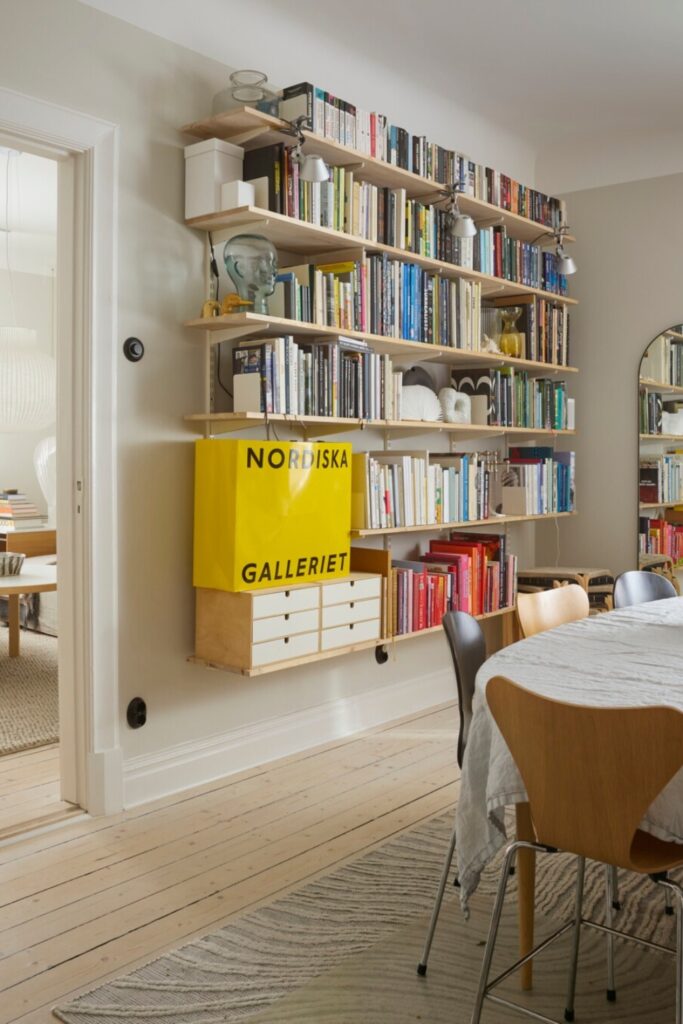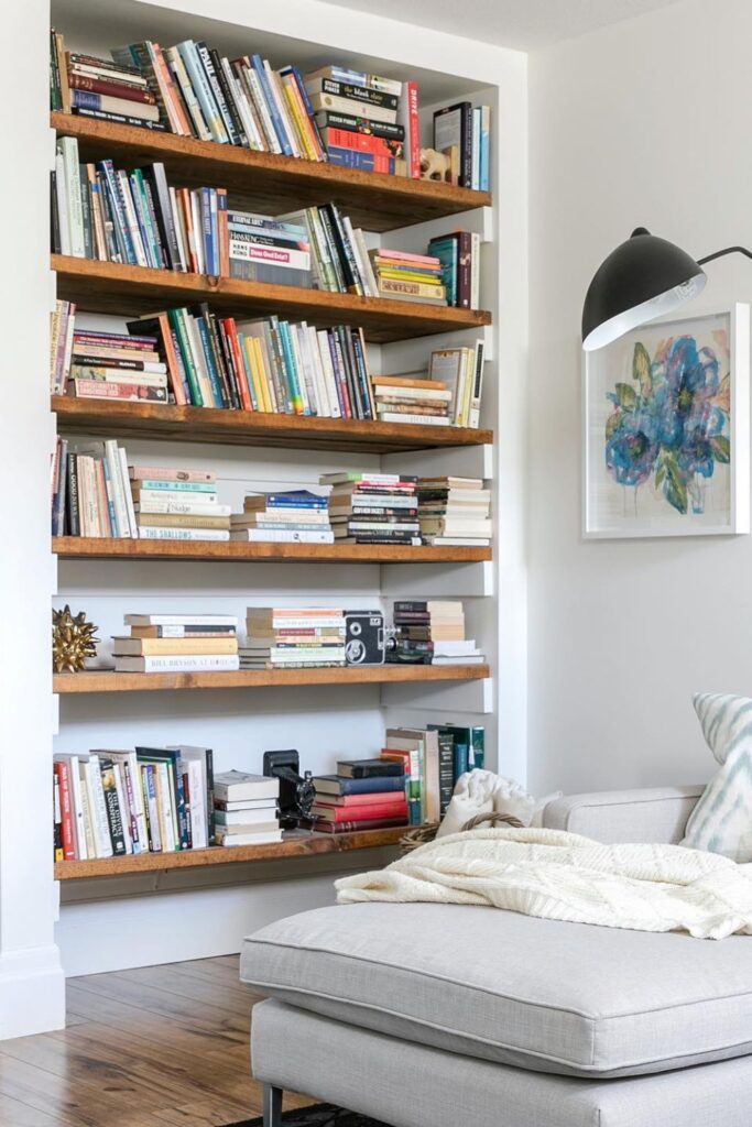When floor space is tight, floating shelves let you create a full library without making the room feel crowded.