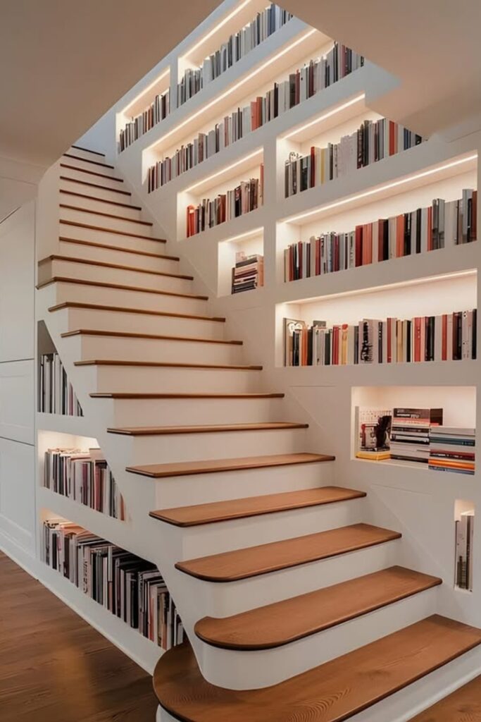 You can turn the often-wasted space around your staircase into a library by lining the walls with recessed shelves.