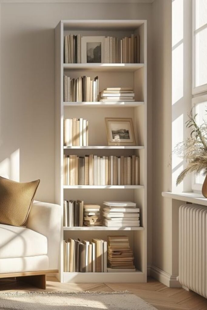 This style fits well in living rooms or bedrooms where you want storage to blend in with your simple decor. To get this look, group books with light-colored covers together.
