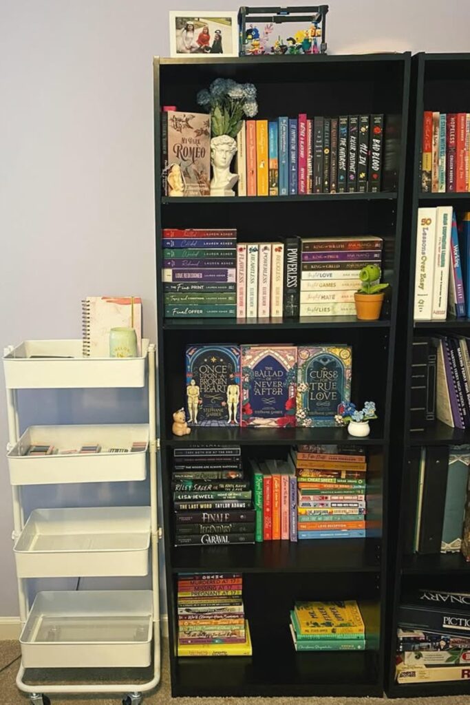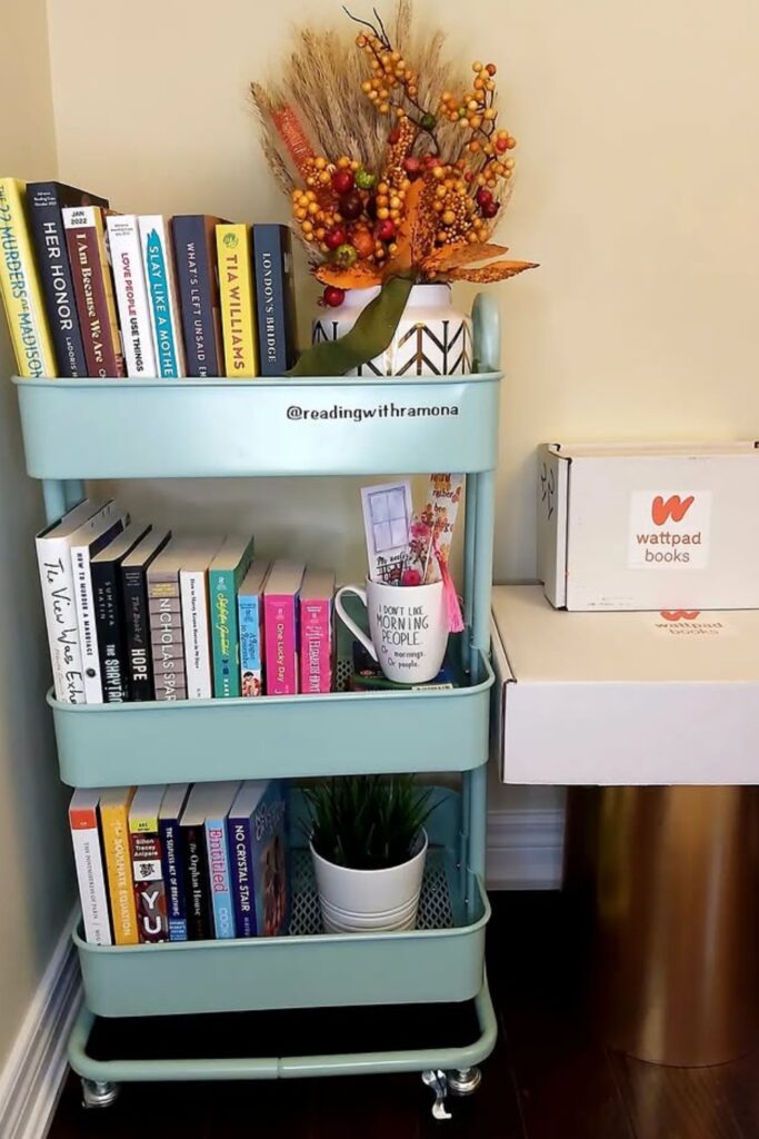To set it up, place a three-tier cart next to your bookcase. Use it to store journals, notebooks, or the books you are currently reading.