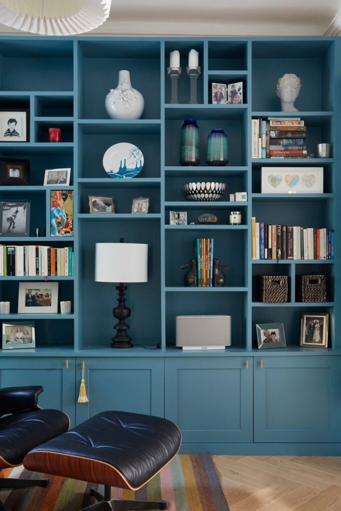 To get this look, you can install built-in shelves and paint them a strong color that goes with your furniture.