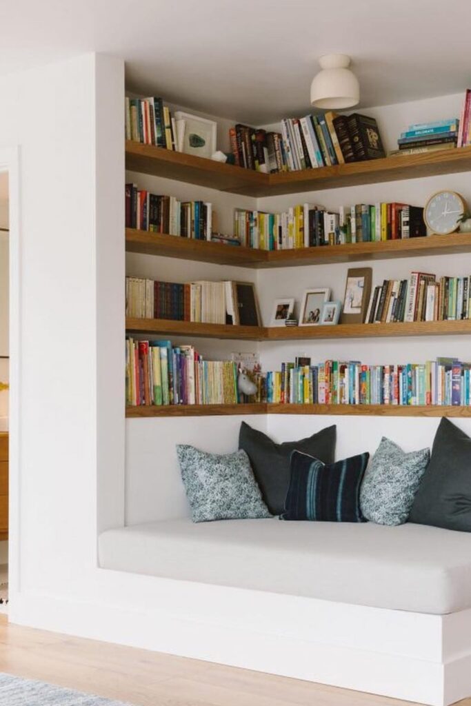 Empty corners often go unnoticed, but adding shelves can give you more storage than a regular bookcase.