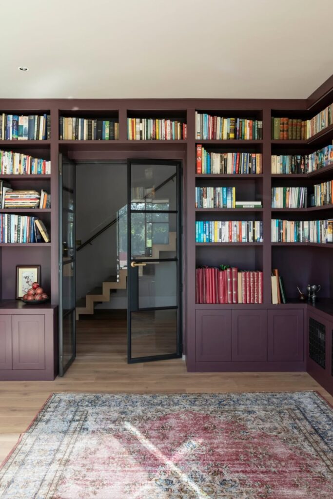 To get this look, use built-in shelves and paint them a strong color, like a deep plum, to make them a standout feature.