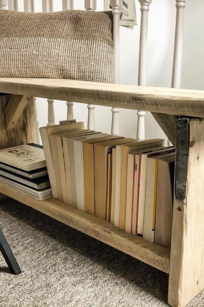 To get this look, you can build a simple bench with a bottom shelf that is tall enough for books to stand upright.