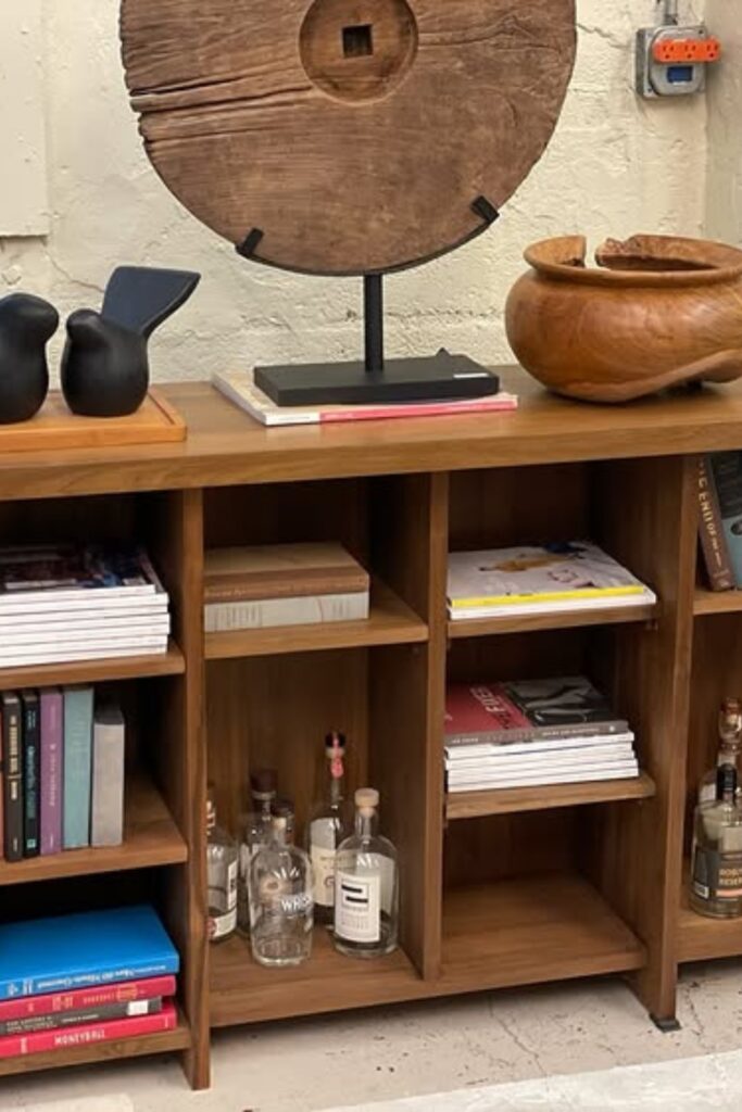 To create this look, pick a wooden console with compartments of different heights. This way, you can stand books upright and stack larger ones flat.