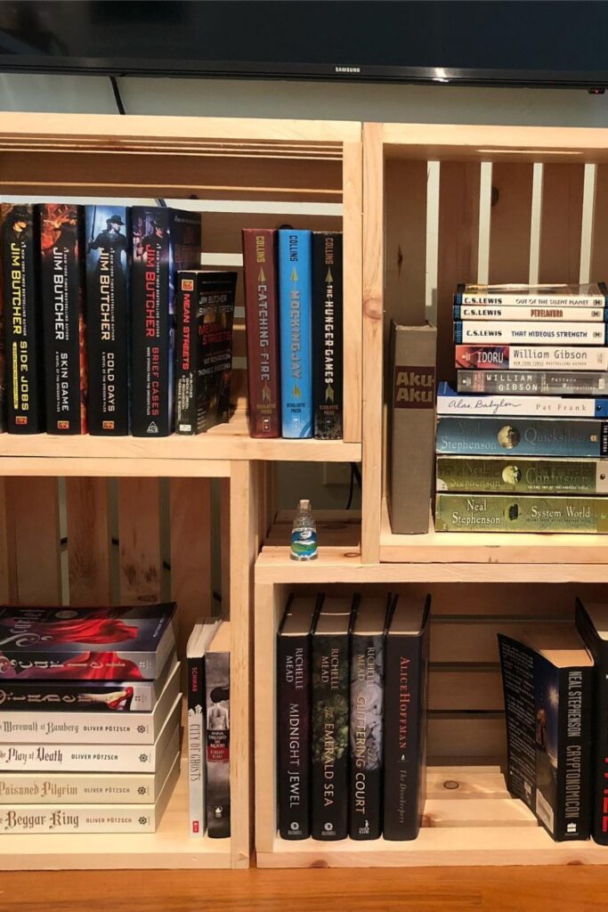 If you are on a budget or enjoy do-it-yourself projects, wooden crates can be a great option for book storage.