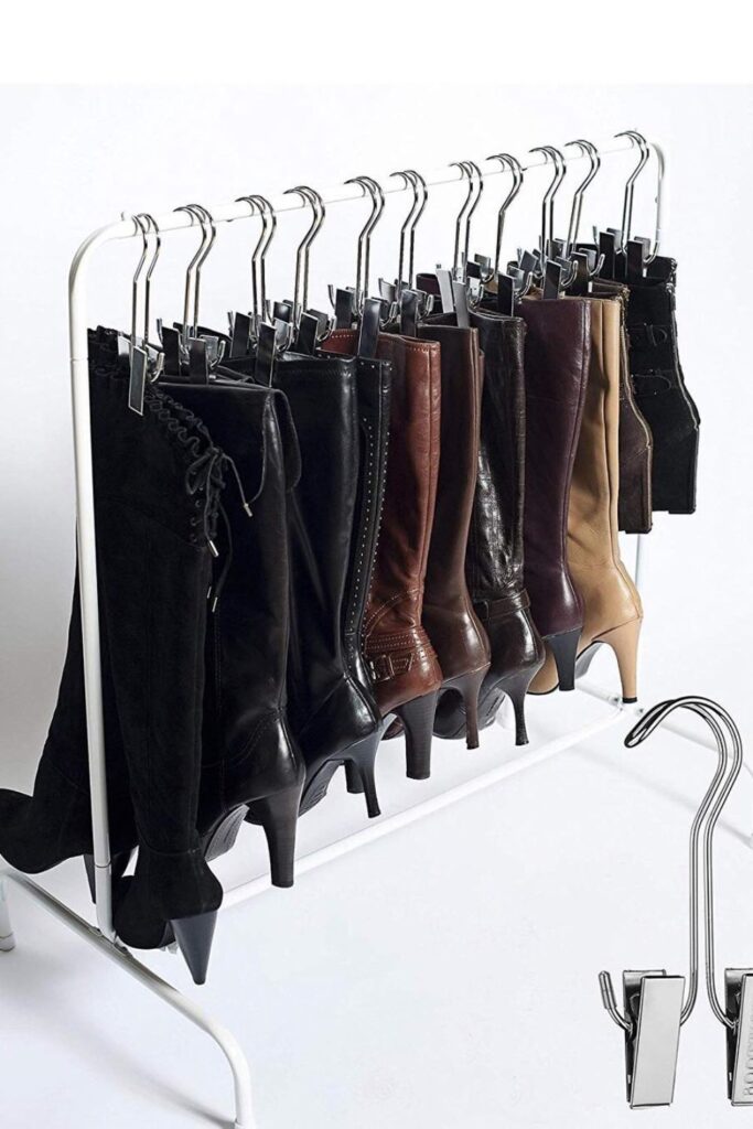 Crowded closets quickly turn tall boots into a wrinkled pile unless they’re kept upright. A simple standing rack with clip hangers solves.