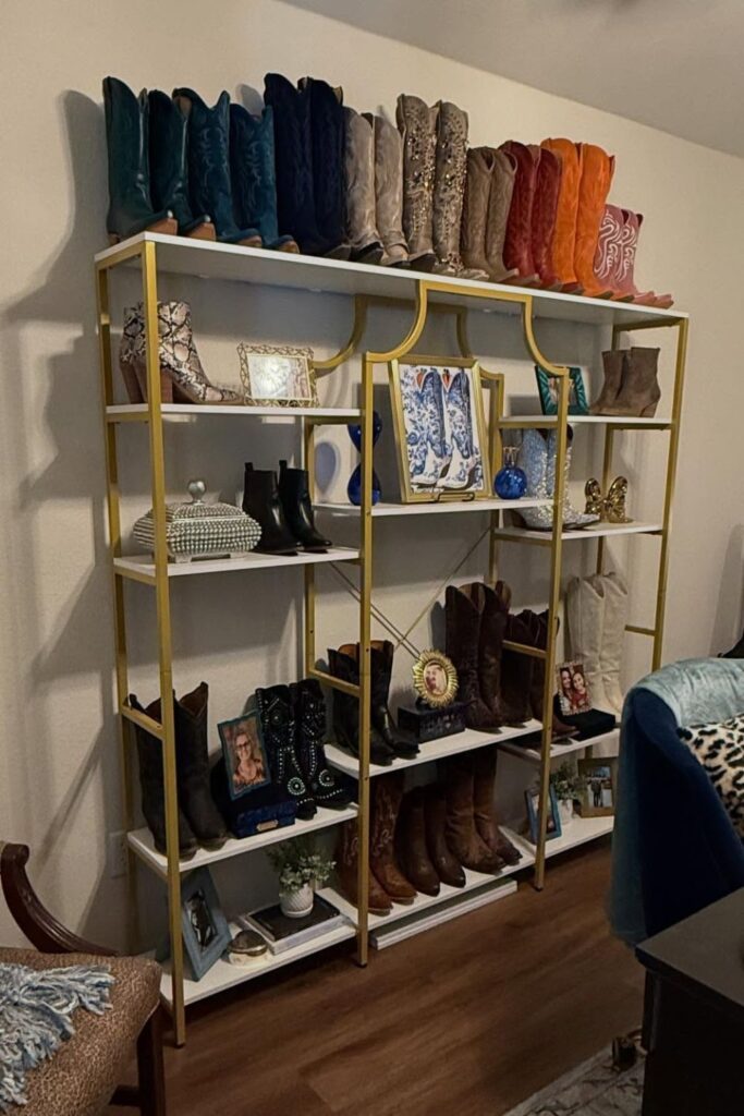 Putting taller boots on the top level makes a strong display, and the lower shelves can house shorter pairs, accessories, or decorative items.