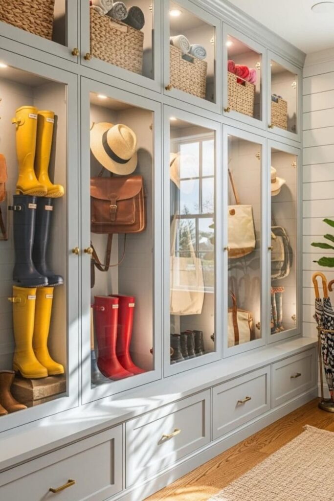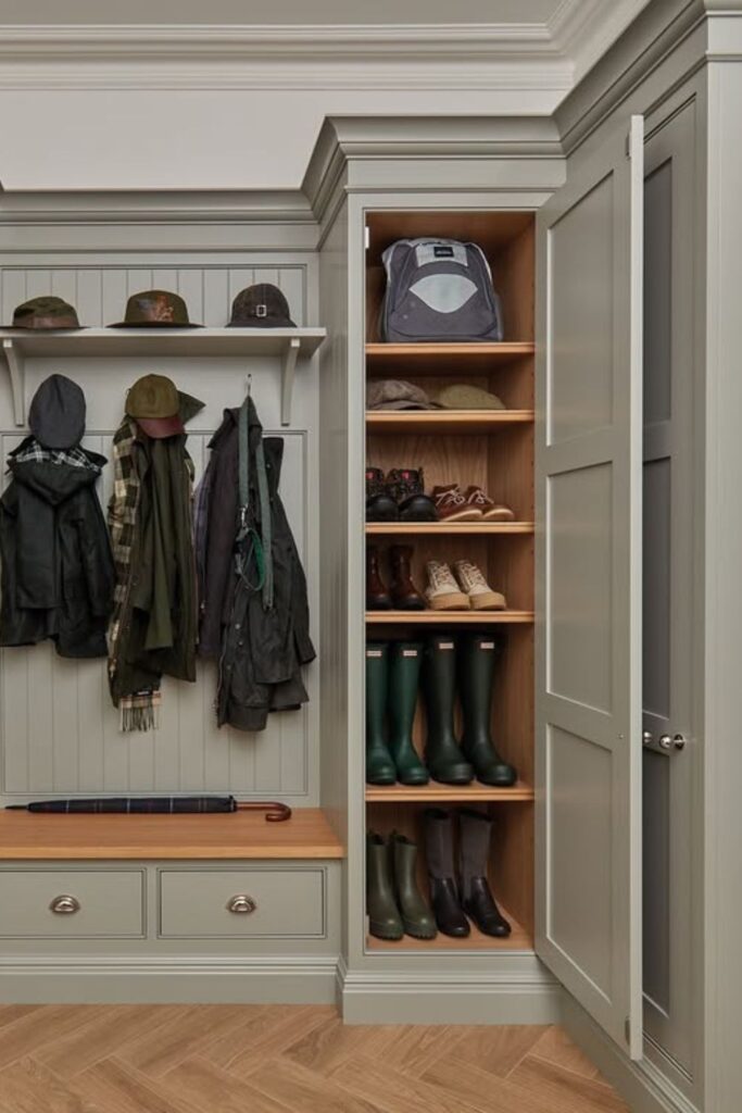 Busy entryways feel far more organized when boots have a hidden place instead of lining the floor near the door.