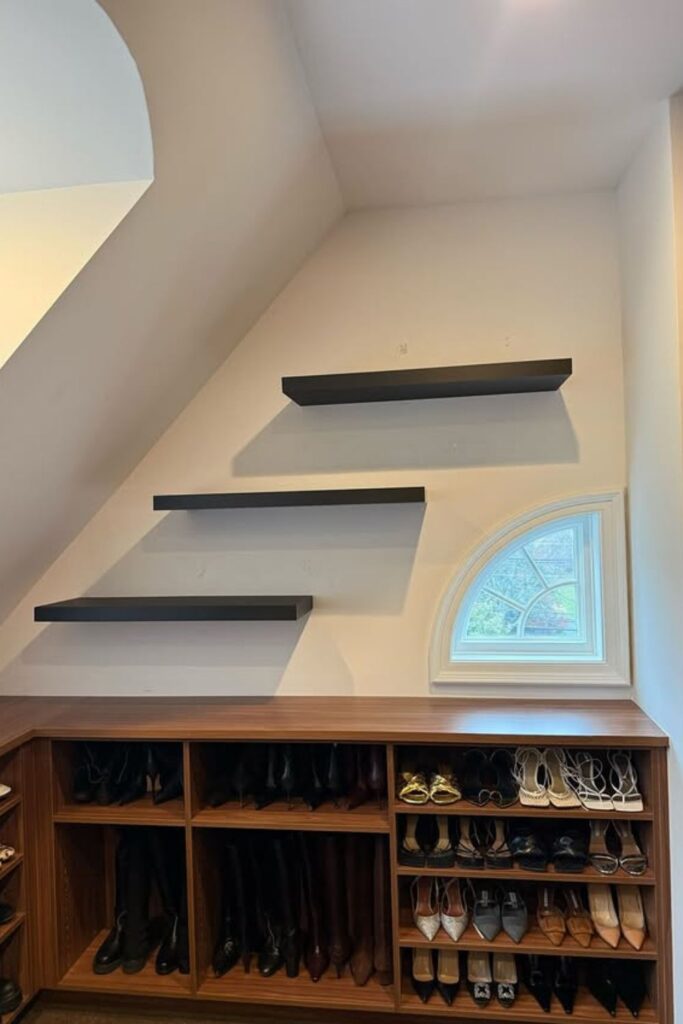 Sloped ceilings and awkward corners often leave closets with dead space that’s hard to use. A built-in cubby system turns that tricky area into practical boot storage.
