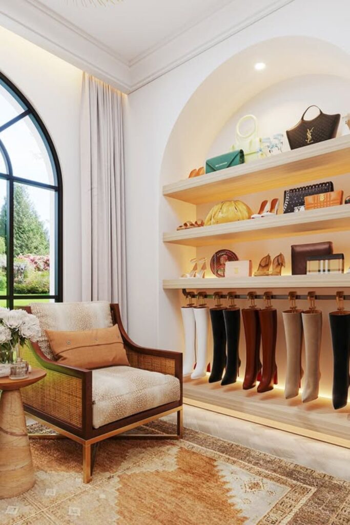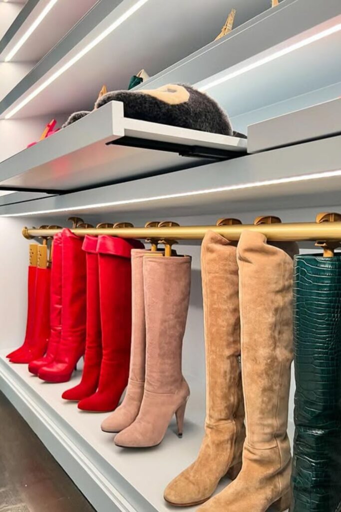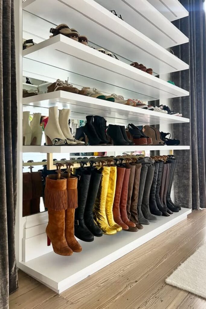Especially well because shorter shoes stay on the shelves while tall boots hang neatly underneath. This layout fits beautifully in walk-in closets or dressing rooms.