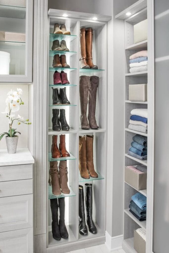 If you use glass or open shelving, the boots will be easy to view and the layout will stay neat instead of congested.