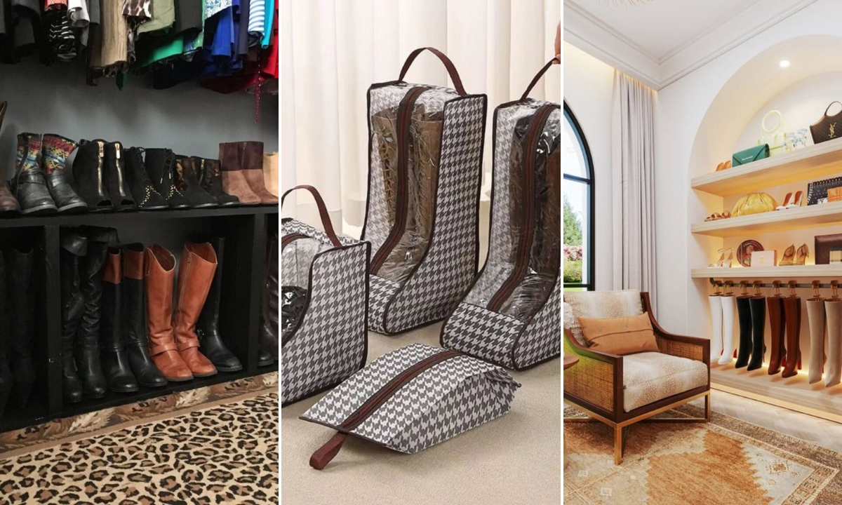 Tall boots usually lose their shape when they’re folded or pushed into a tight shelf. Hanging them from a rod with sturdy boot hangers.