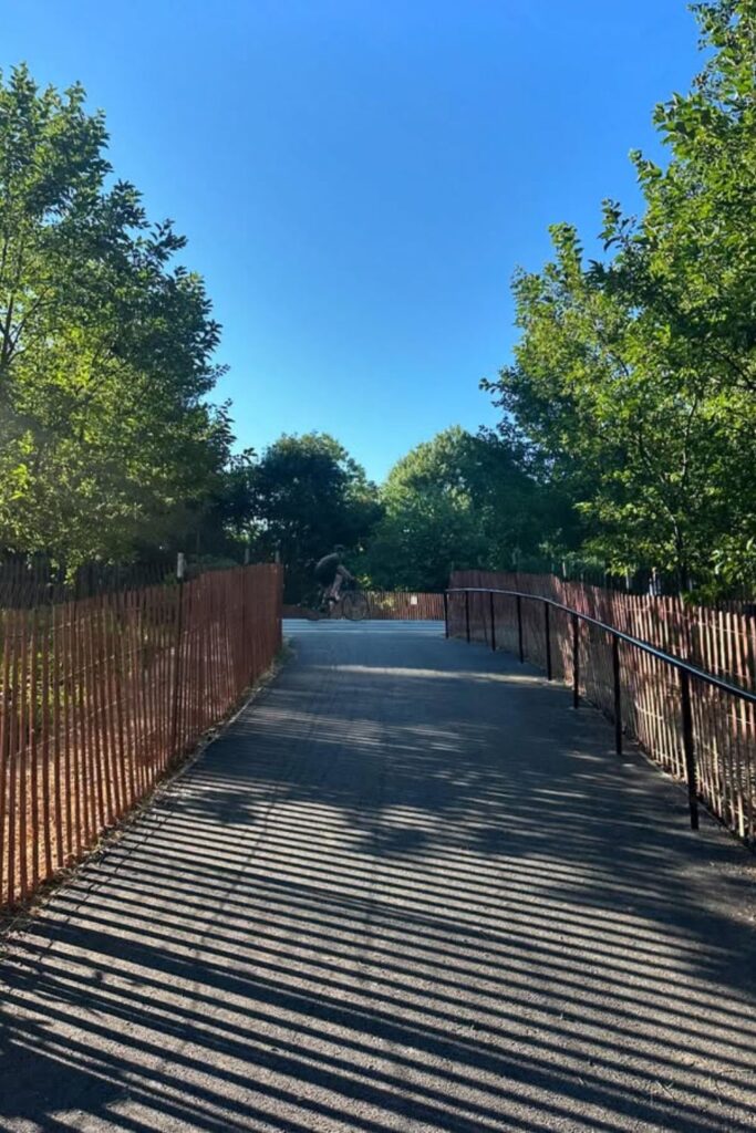 Perfect for sloped areas, this walkway uses smooth asphalt paired with sturdy safety railings.