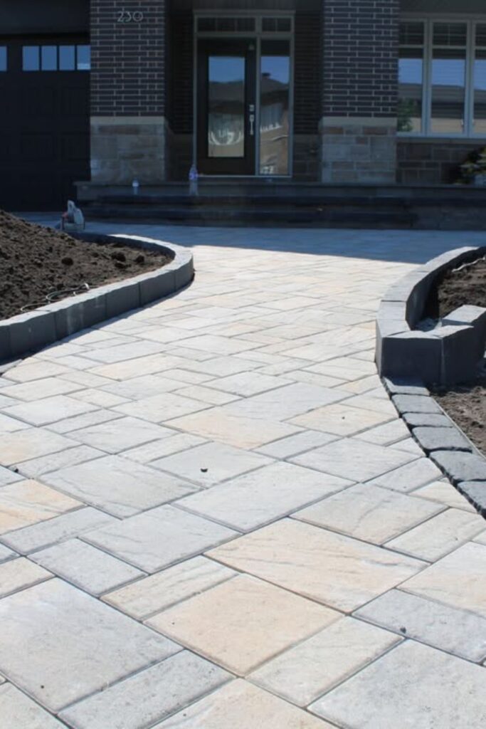 The neutral tones pair beautifully with most home styles, while dark stone edging frames the path for a polished finish.