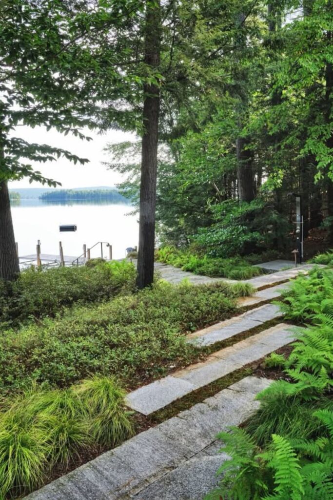 Guide the way to the water with long stone slabs placed on a natural slope.