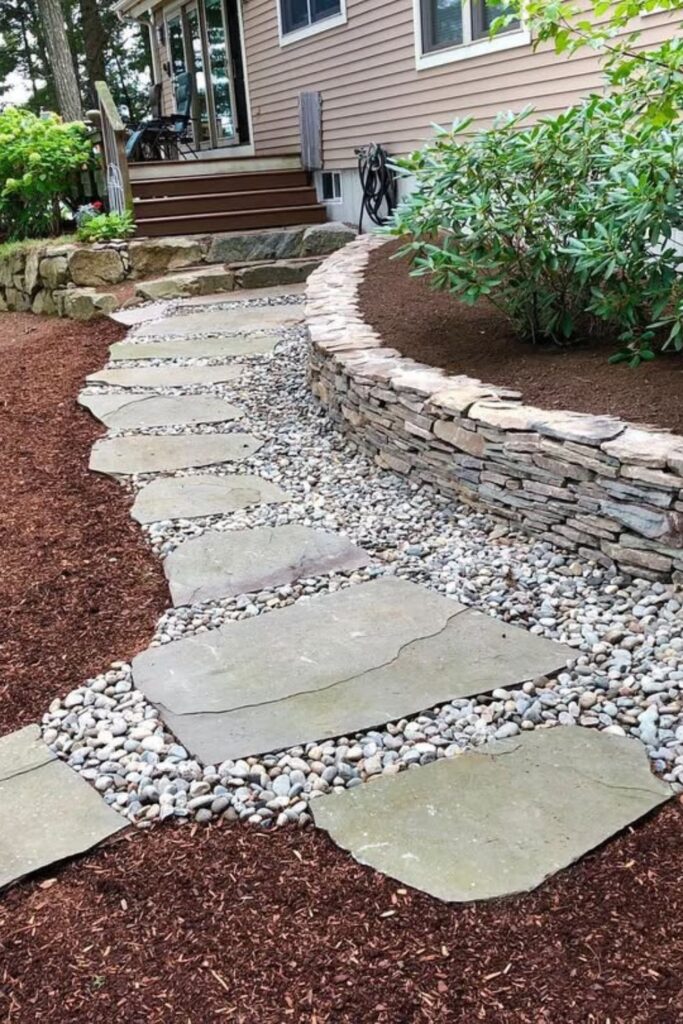 Combine irregular stone pieces with small river pebbles to craft a textured, rustic path.