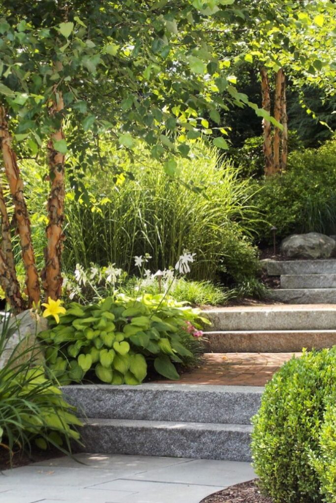 Surround the stairs with shade-loving plants like hostas and ornamental grasses, letting them spill slightly for a lush, vibrant feel.