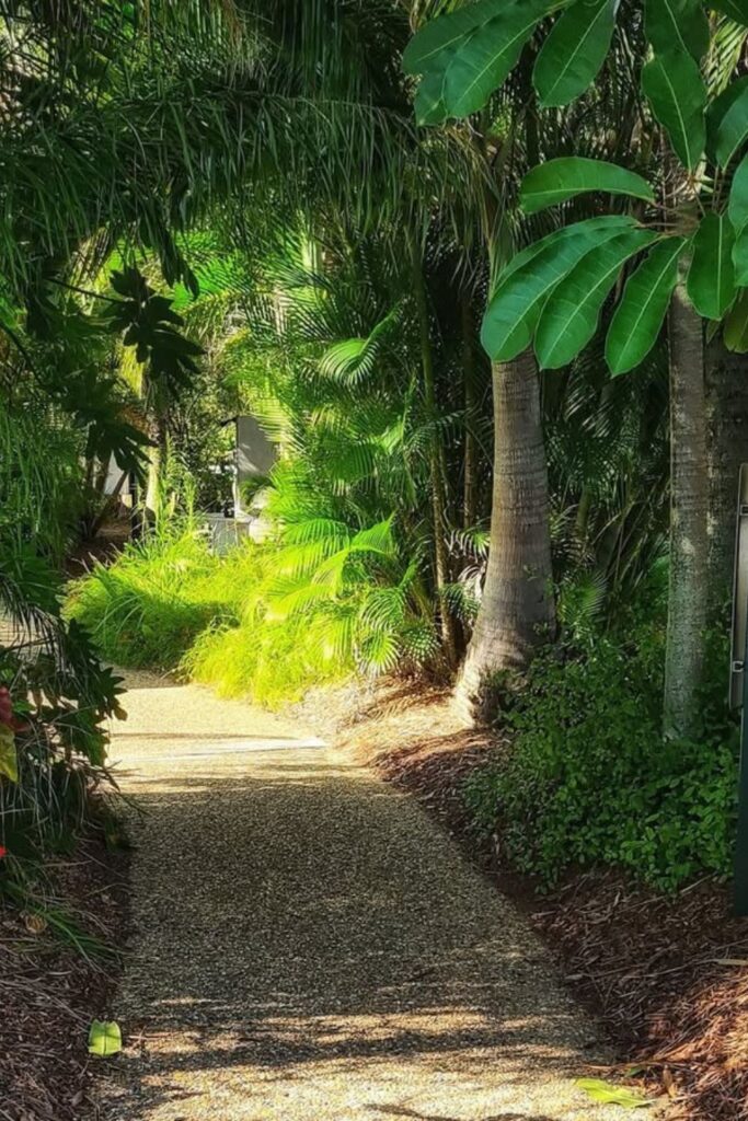 This lush pathway uses a compact pebble surface that winds through dense tropical greenery.
